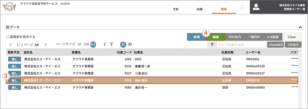 (1) 上部の「メニュー」から「社員リスト」を選択