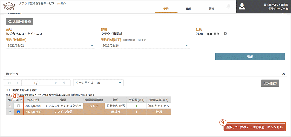 ※2.で退職処理を行っても、その方が退職日以降も予約をしている場合、給食会社に発注がかかってしまうため、退職日以降の予約データを削除またはキャンセルします。